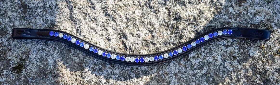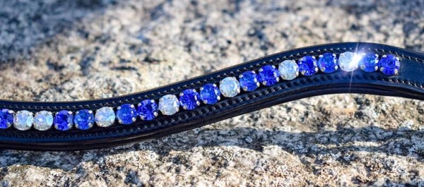 Weich unterlegter Stirnriemen mit einem frischen Farbverlauf in blau und blau scheinendem crystal, silberfarben gefasst