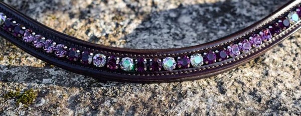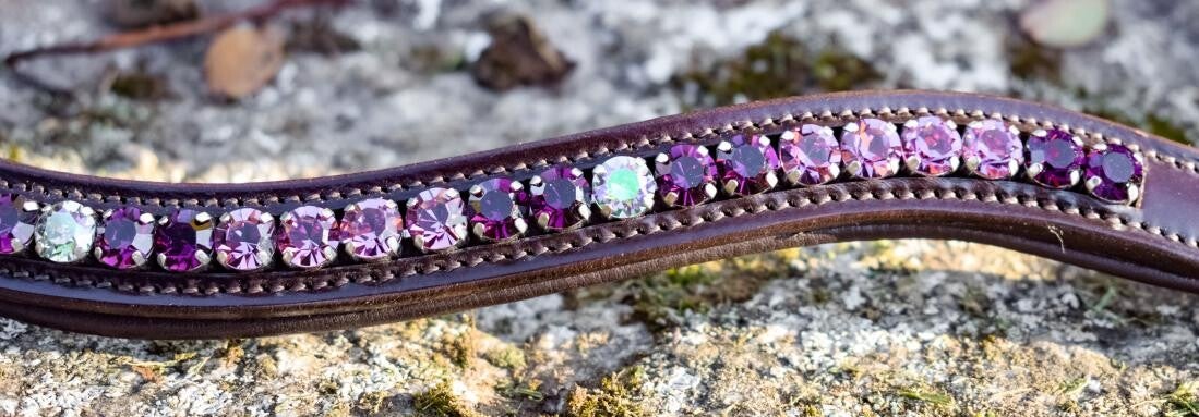 Weich unterlegter Stirnriemen mit einem einzigartigen Farbverlauf aus Rotviolet und buntem crystal Effekt, silberfarben gefasst