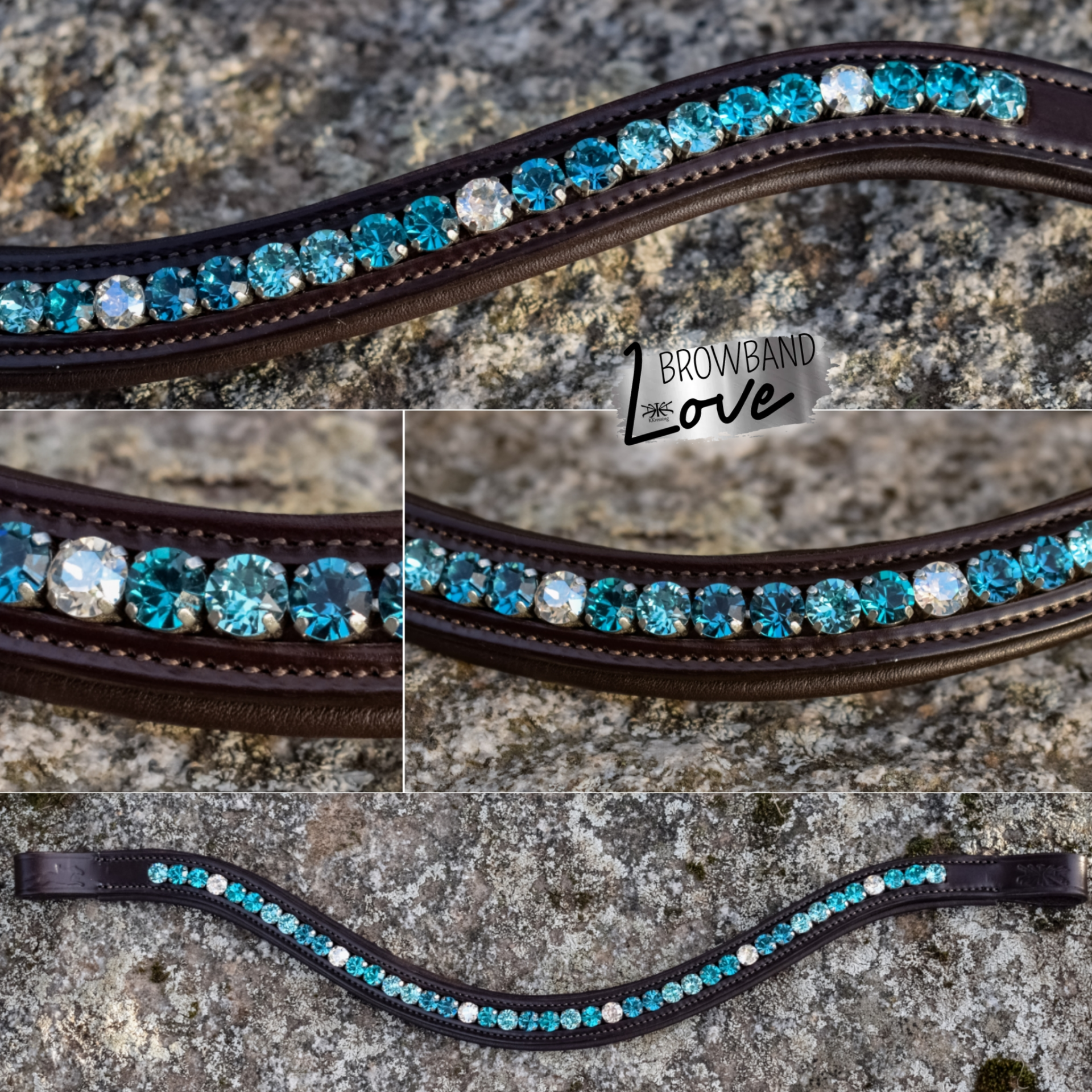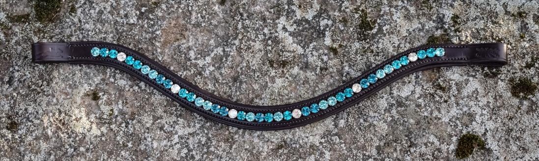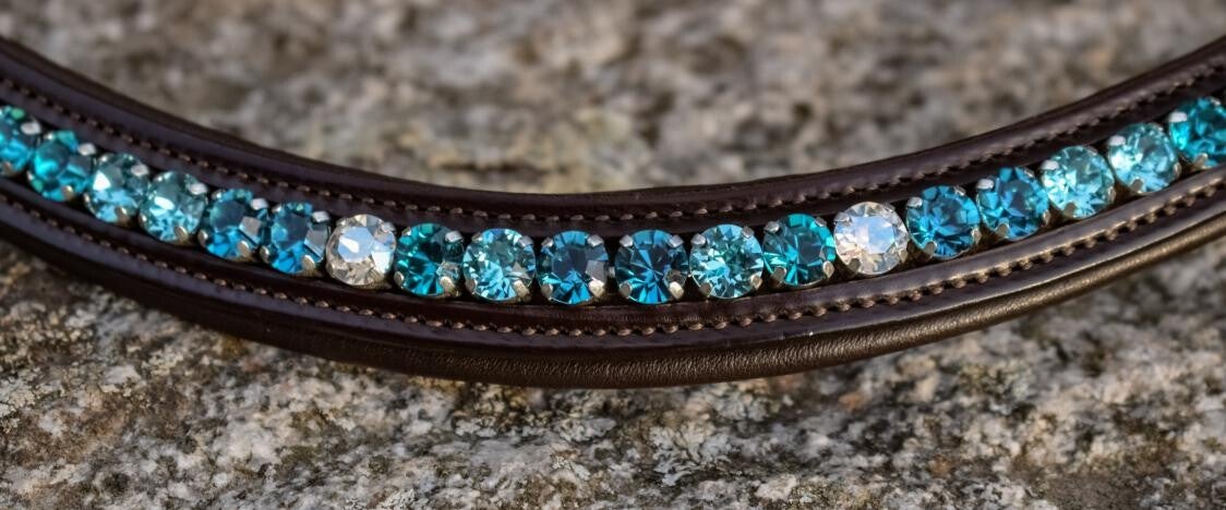 Weich unterlegter Stirnriemen mit hellblau türkisen Strassteinen und türkisem crystal Highlight, silberfarben gefasst
