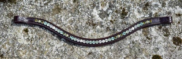 Weich unterlegter Stirnriemen mit Strass und Halbperle in sanften Grüntönen mit einem Touch von gold, silberfarben gefasst