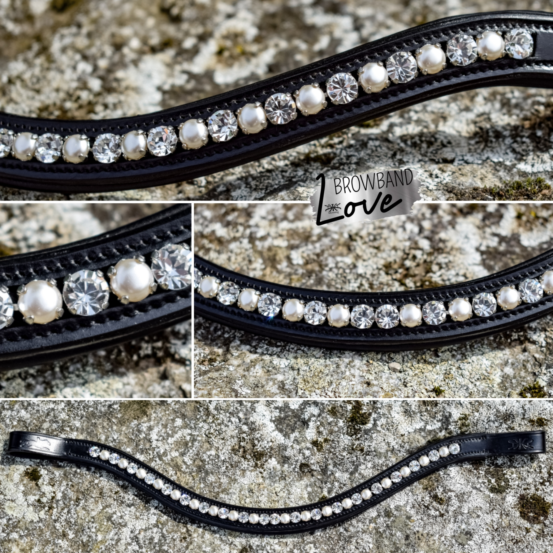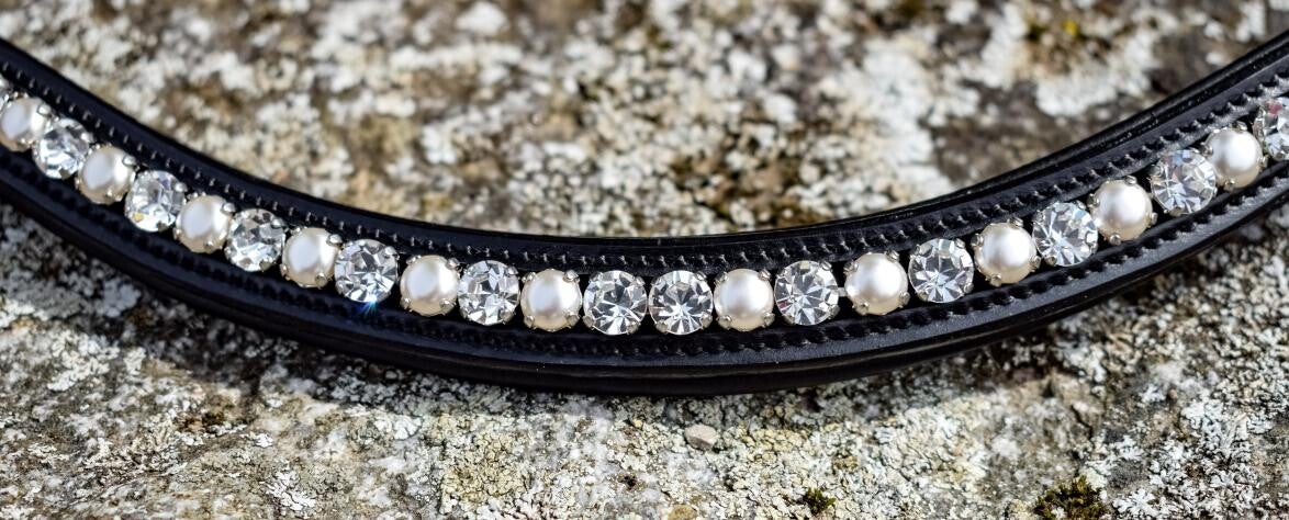 Weich unterlegter Stirnriemen Strass und Halbperle in weiß, silberfarben gefasst, #musthave zum Turnier