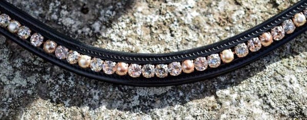 Weich unterlegter Stirnriemen mit einem edlen und zeitlosen Farbverlauf in Creme und Altrosa, rosegoldfarben gefasst