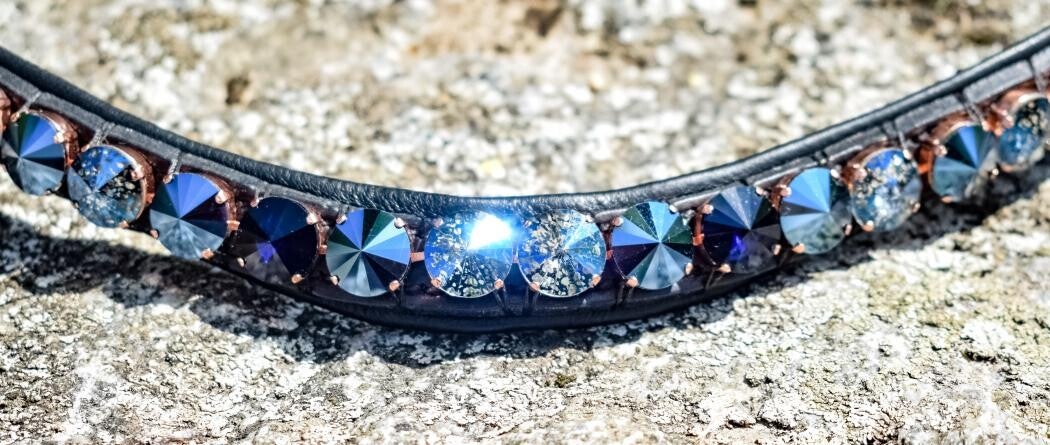 Geschmeidig unterlegter Slim Line Stirnriemen mit rosegoldfarben gefassten XXL Glas-Kristallen (14mm Rivoli) - 100% Handmade in Germany