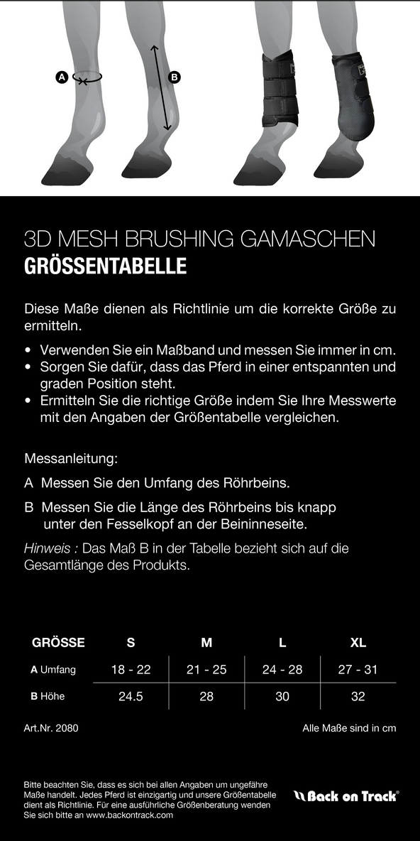 Die Back on Track Brushing Gamaschen 3D Netz mit Welltex® bieten eine einzigartige Kombination aus Schutz, Qualität und Wohlbefinden. Die weiche Neopren Innenseite der Gamasche sowie die 3D Netz Außenseite mit stoß absorbierender Polsterung garantieren beste Atmungsaktivität und eine optimale Passform. Diese universal einsetzbaren Gamaschen sind, je nach Größe, sowohl für die Vorderbeine als auch für die Hinterbeine geeignet. Die Klettverschlüsse sorgen für eine schnelle und einfache Handhabung.