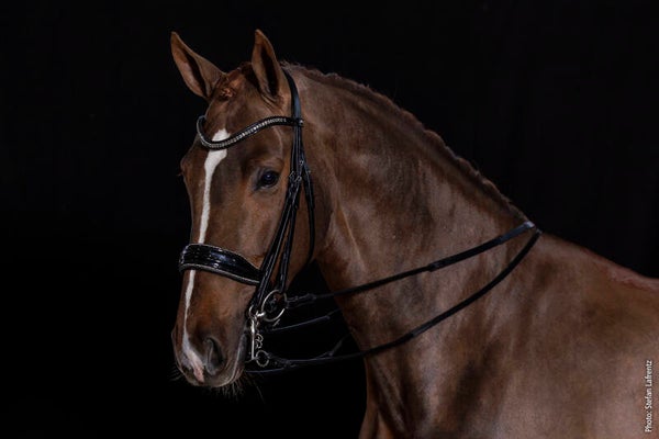 Die Kandare MILAN GLAM aus ökologischem Leder von Schockemöhle Sports lässt hinsichtlich Optik, wie auch Funktionalität keine Wünsche offen. Das vorgeformte Spezialreithalfter mitsamt flacher Seitenteile liegt ideal am Pferdekopf an. Zwischen den beiden mitgelieferten Stirnbändern mit Lack und großen Kristallen, sowie in schlichtem Leder besteht die Wahl. Jetzt neu gibt es die MILAN GLAM auch mit einem Nasenband in Lack mit Glitzer-Paspel.