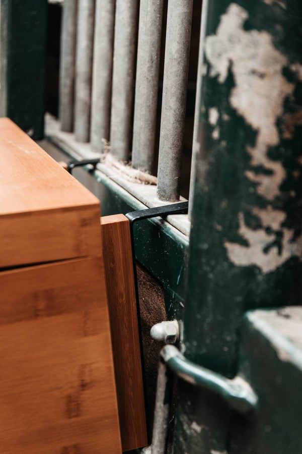 Utensilien in der Nähe Ihres Pferdes aufbewahren können. Die Putzbox ist 30 cm hoch, 40 cm breit und 28 cm tief und somit geräumig, ohne sperrig zu sein. Der obere Teil kann über zwei goldene Druckknöpfe, an denen Sie auch ein Schloss anbringen können, geöffnet und geschlossen werden. Im Inneren befindet sich ein großes Fach (25 x 38 x 26 cm), das dank zweier dünner rausnehmbarer Teile in zwei oder drei weitere Fächer unterteilt werden kann. Sie können das Innere Ihrer Putzbox ganz nach Ihren Wünschen organisieren! Dank der zwei großen Haken an der Rückseite lässt er sich auch sehr leicht aufhängen. Sie besteht aus Bambus, was ihn besonders widerstandsfähig und sehr leicht zu reinigen macht.