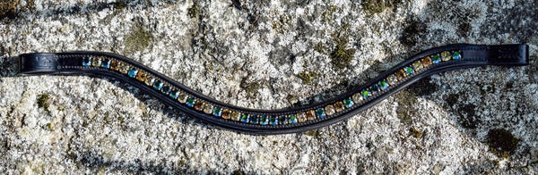Weich unterlegter Stirnriemen mit dunkelblauem metallic, braunem und goldem Strass, goldfarben gefasst; #perfectmatch zur Royal Classic von Equestrian Stockholm