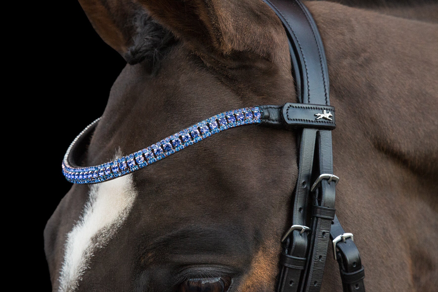 Das Glitzerstirnband “Malaga” mit drei Reihen Kristallen lässt ihr Pferd erstrahlen. Durch den einfachen Verschluss aus Druckknopf und zusätzlichem Klett können Sie das Stirnband komfortabel austauschen.