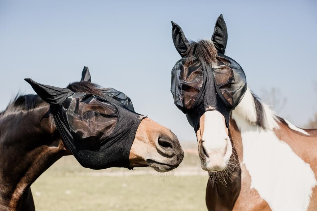 Die Maske besteht aus starkem Netzgewebe und Lycra, was das Eindringen von Insekten verhindert. Aufgrund der Kunststoffformen vor der Stirn berührt die Maske die Augen des Pferdes nicht und bewegt sich immer in ihre ursprüngliche Form zurück. Die Maske kann mit einem Reißverschluss und einem Druckknopf geschlossen werden. Um die Maske zu waschen, legen Sie sie einfach bei 30 Grad in die Waschmaschine.