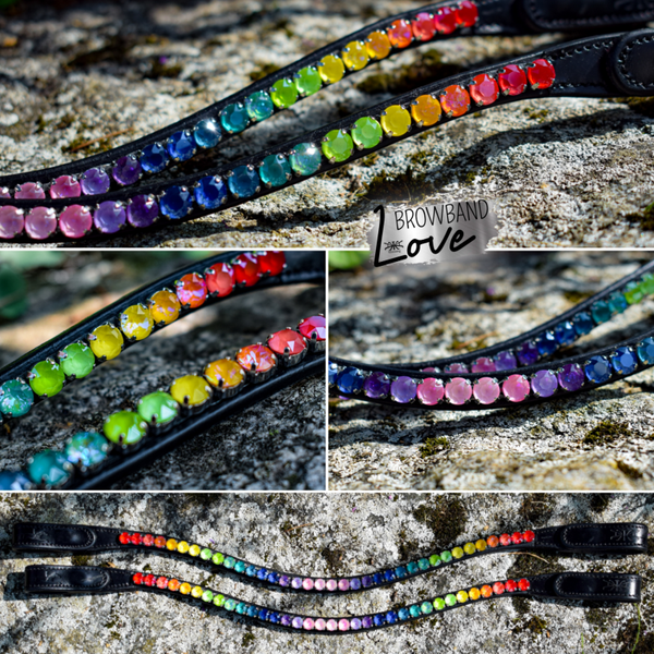 Weich unterlegter Stirnriemen mit einem Farbverlauf ais bis zu 21 verschiedenen Strasssteinen der Farben des Regenbogens, silberfarben gefasst - einzigartig, wunderschön und lebesfroh